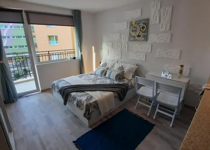 Studio Apartment With Pool View, Sunny Beach van 38 m² is gelegen op ongeveer 15 minuten met de auto van de Kerk van de Heilige Aartsengelen Michaël en Gabriël en op 2 km van Kartbaan. Er is ook een privézwembad voor een nog aangenamer verblijf.